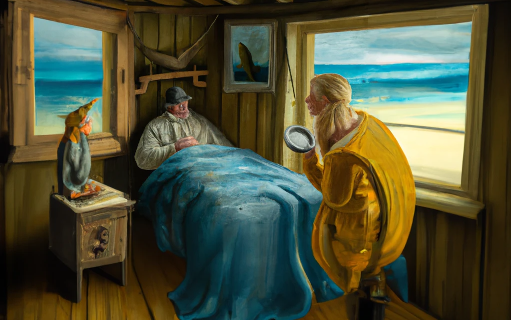 She raced back to the cabin, where Cid was waiting for her. He was awake, and smiled when he saw the fish. “You did it!” he said.
