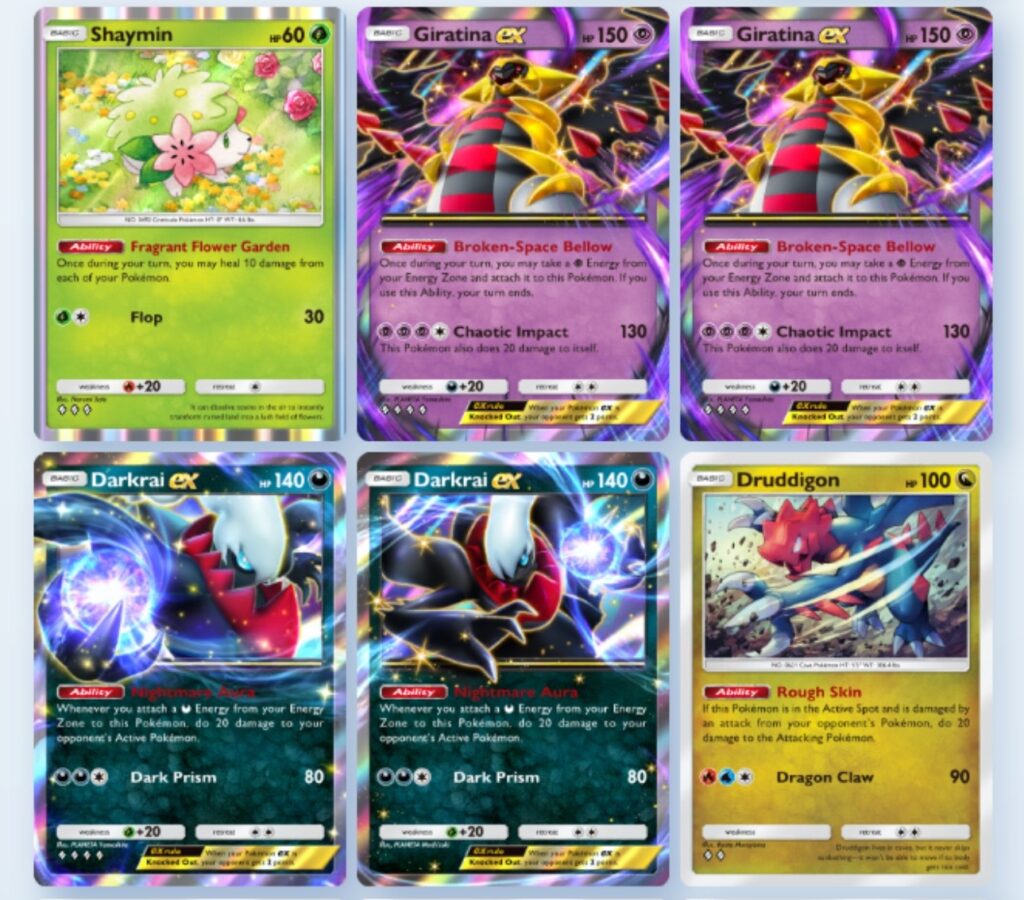 Shining Revelry introduced, besides shinies, a bunch of new EX cards, chief among them, Giratina EX. Giratina conjures psychic energy out of thin air. Darkrai EX damages the opponent whenever it takes dark energy from the energy pool (the only kind of energy). Druddigon is there to stand in the active spot and just exist. We don’t have fire or water energy, so it will never attack. It just punishes attackers, and if you have the Rocky Helmet upgrade, it will return 40 damage with each hit, and Shaymin (we have no leaf power either) can passively heal every damaged Pokemon for a small amount.