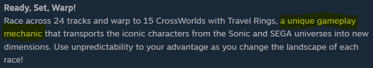“Ready, Set, Warp! Race across 24 tracks and warp to 15 CrossWorlds with Travel Rings, a unique gameplay mechanic that transports the iconic characters from the Sonic and SEGA universes into new dimensions. Use unpredictability to your advantage as you change the landscape of each race!”