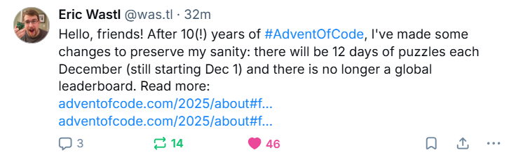 I was a little more surprised that he’s deleting the global leaderboard. Some people, it seems, are a little too excited by it, even going so far as to DDoS it to keep people from updating. Past couple of years, but especially last year, the top spots of the leaderboard were set by people who had completed both halves of the usually pretty tough puzzles in less than a minute, in many cases much less. The global leaderboards had been made pointless by both AI and very fast solvers, or very fast solvers using AI to simplify the puzzle for them.
