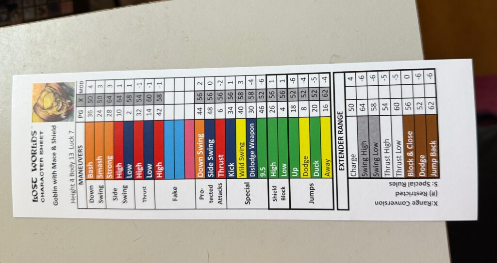 Until now, that is. Because while Kasul and I were out shopping this weekend, I saw a bunch of these Lost Worlds books at Tabletop Games in Newington (CT). I bought the “Female Warrior with Sword and Chainmail”/“Giant Goblin with Mace and Shield” (actually a morningstar but who cares). In these books, you keep your maneuver card and hand your book to your opponent and they hand you theirs. You’ll see their character standing in front of you, and they’ll see yours.
