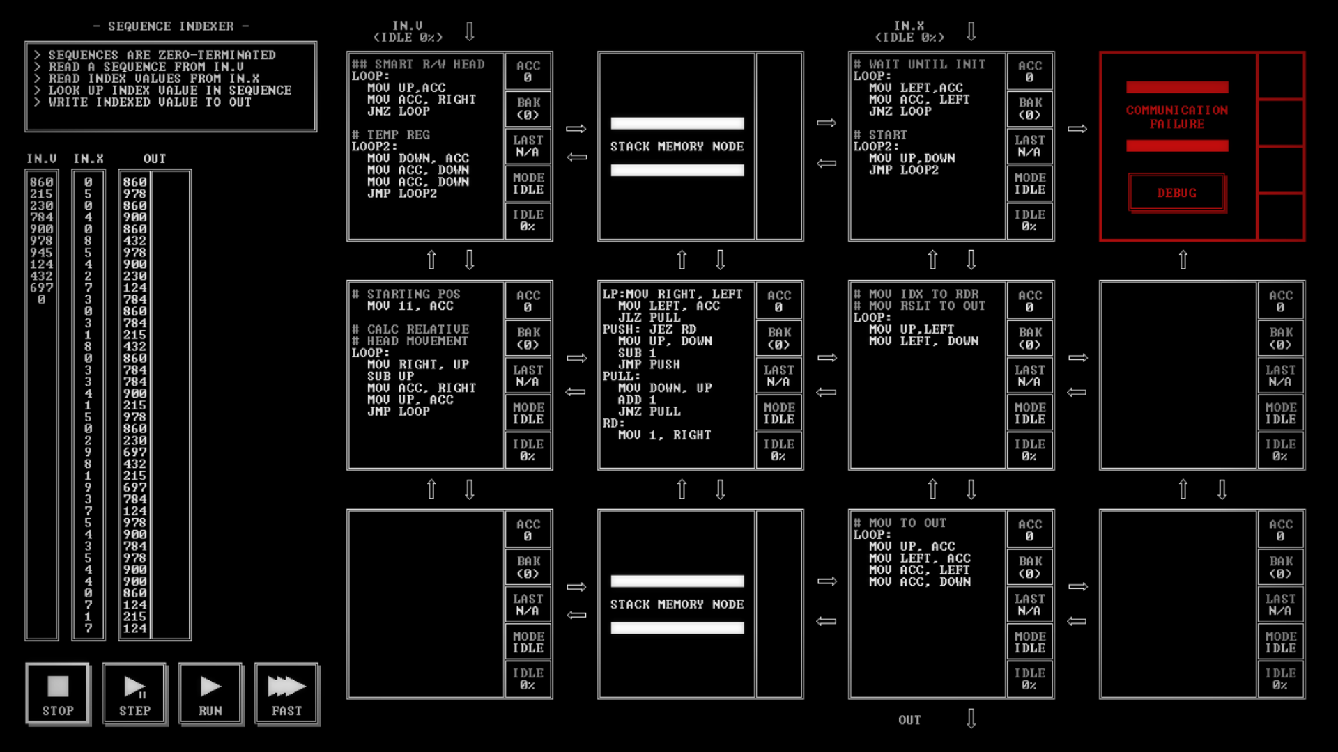 Sequence Indexer program It’s been long enough that I should go over what TIS-100 IS. TIS-100 is a programming puzzle game by the makers of SpaceChem (a previous obsession). Where SpaceChem kind of hid the programming knowledge necessary to solve the puzzles beneath a fun graphical abstraction, TIS-100 just strips away the candy coating. TIS-100 simulates a fictional multicore reduced instruction set computer (RISC). There is no RAM. Sometimes there is a stack or two. Each processor has just one directly-accessible register. ...