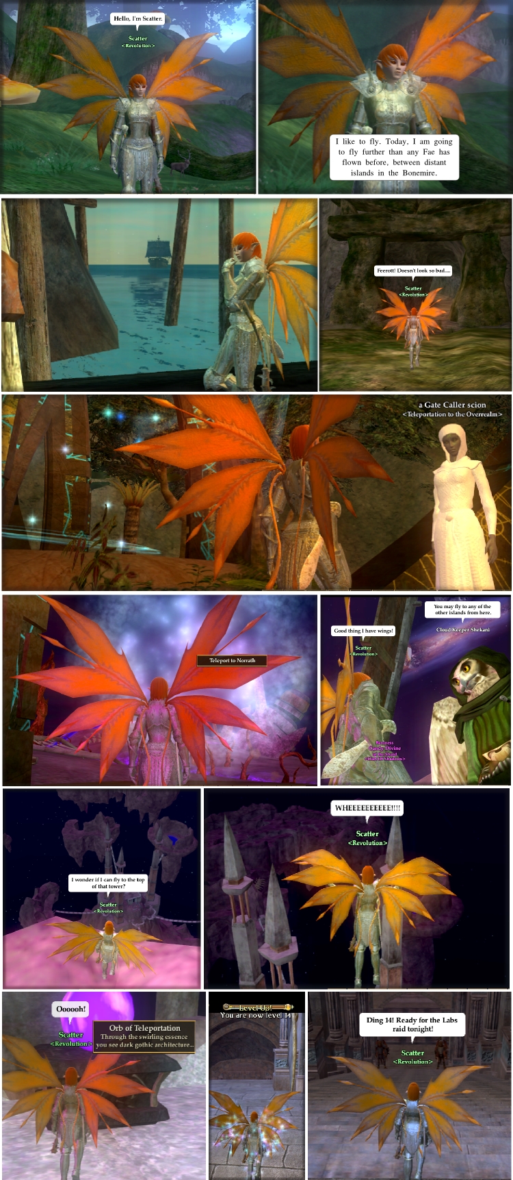 I used to make a lot of comics for EQ1 but haven’t done the same yet with EQ2. Here’s a little comic about my level 13 Fae berzerker traveling to the Bonemire to make the longest flight ever - from the Catotoxic Stain to the Halls of Fate. In my next comic, I won’t use any in-game text balloons. They tend to be in bad places and don’t take well to zooming and cropping and don’t give me the freedom to change what PCs and NPCs are saying. Also, instead of using Photoshop for the whole thing, I used “The GIMP” to prepare the panels and Inkscape for the one text balloon I added, compositing and export of the final product. ...